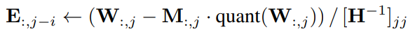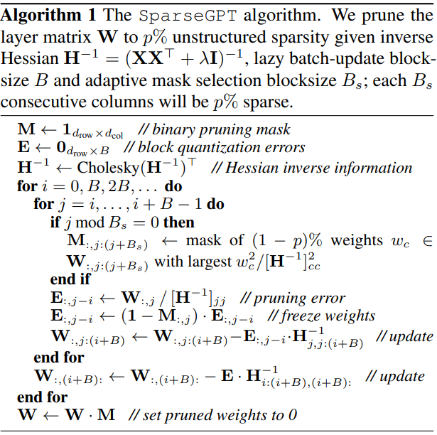 문제를 해결하기 위해 입력 차원(열 개수)을 블록으로 나누고 OBS 업데이트 오류를 기반으로 블록 내에서 가지치기 쉬운 p%의 가중치를 잘라낸다. (참고: OBC)