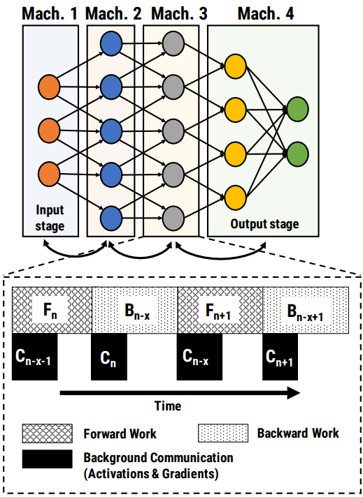 - 계산과 통신 시간을 겹침으로써 하드웨어 효율성이 올라감(순전파 계산 중 역전파 데이터가 들어오고 역전파 계산 중 순전파 데이터가 들어옴으로써 통신 오버헤드가 없음.)