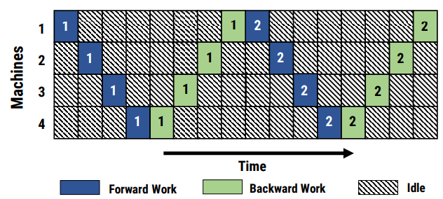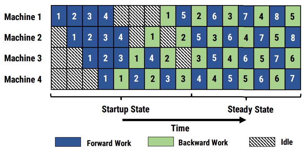 Device가 유휴 상태가 되지 않도록 순전파와 역전파를 번갈아 수행하는 1F1B(one-forward-one-backward) 제안.