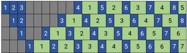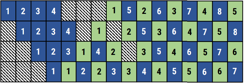 미니배치 5는 순전파와 역전파 모두에서 5의 입력 시 가장 최신 버전의 가중치였던 미니배치 1에 의해 업데이트된 가중치 W(1)을 사용하며, 역전파 후에는 W(1)을 삭제하고 버퍼에 W(5)를 추가한다.