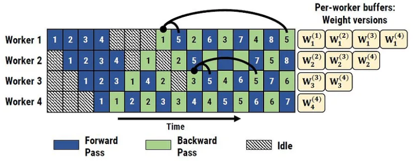 각 device에서 활성 미니배치 당 하나씩 각 버전의 가중치를 저장하여 역전파 시 활용한다. 순전파 시에는 가장 최신 버전의 가중치가 사용된다.