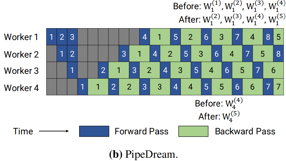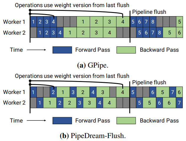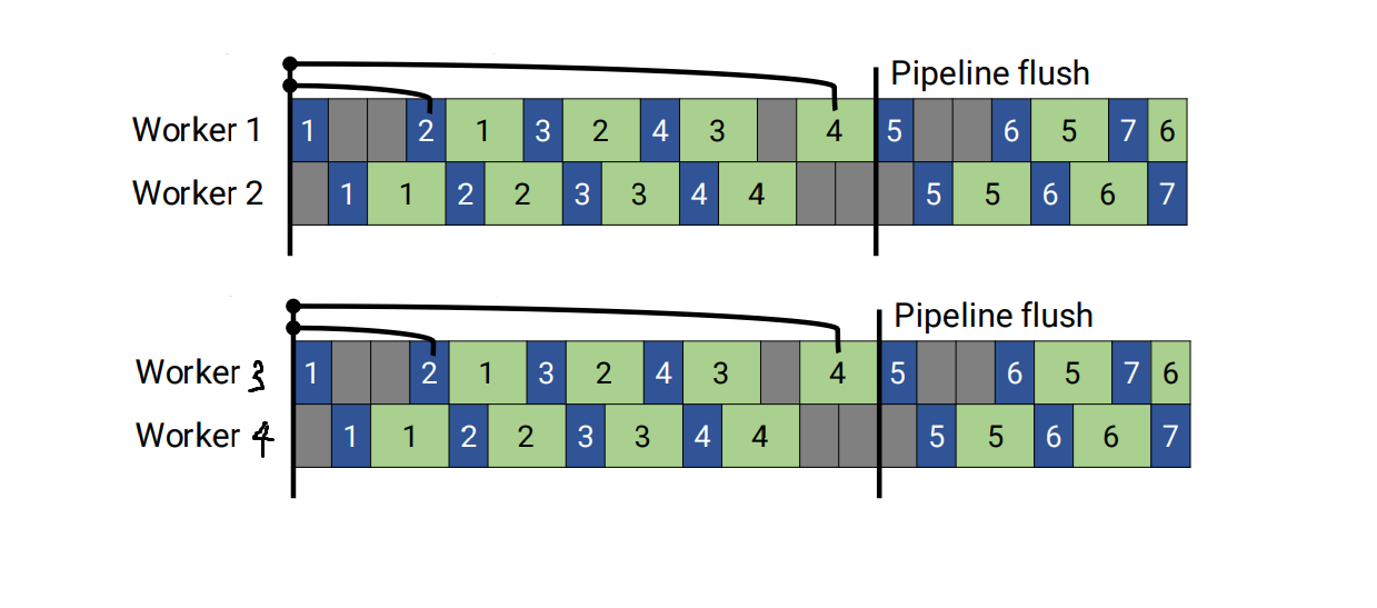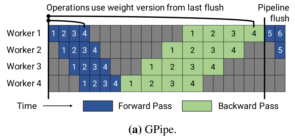PipeDream with pipeline flush version. 2BW보다 처리량은 낮지만 가중치 저장이 없어 메모리 효율적이다.
