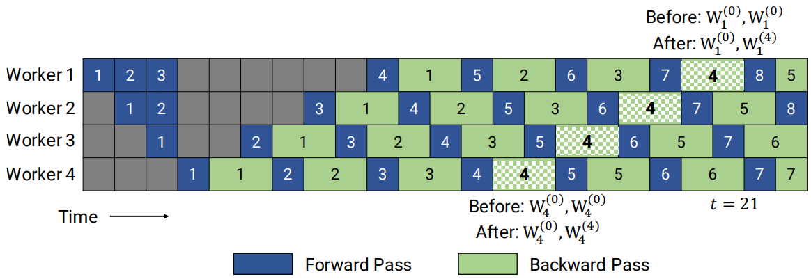 기울기를 누적하여 m개의 마이크로 배치(이하 MB)마다 새로운 가중치 생성. 가중치 업데이트 시 업데이트 전 입력 MB는 여전히 이전의 가중치를 사용하므로 2개의 가중치 버전이 필요하다.
