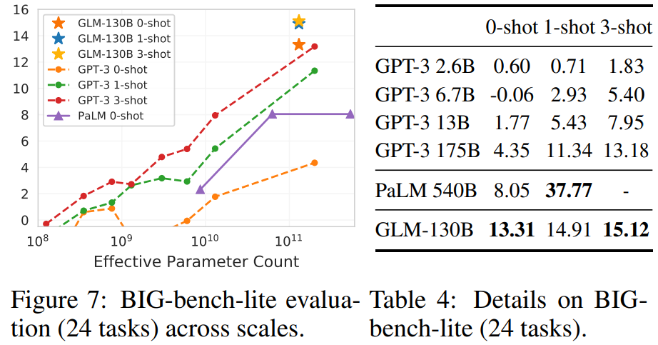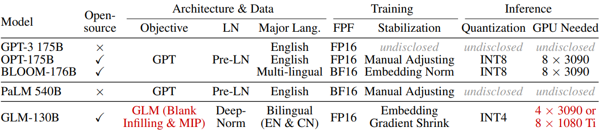 또한 많은 사람들이 LLM 연구를 수행할 수 있도록 단일 A100 서버에서 추론할 수 있는 크기, INT4 양자화를 채택했다.