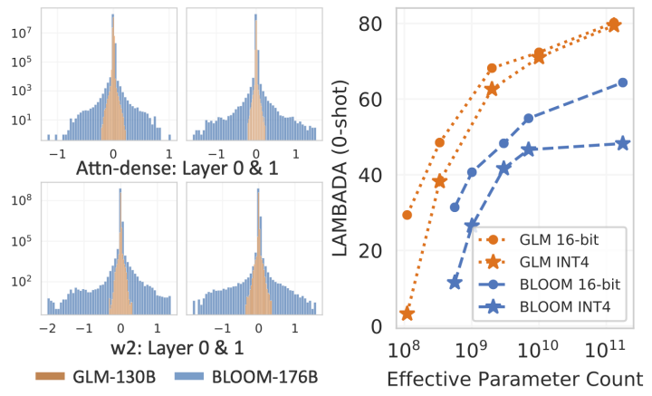 분포가 넓을수록 양자화 손실이 더 커지는데, 이를 통해 GPT style인 BLOOM의 INT4 양자화 실패를 설명할 수 있다. GLM은 GPT style보다 분포가 훨씬 더 좁은 경향이 있으며, 이는 양자화 손실을 줄인다.