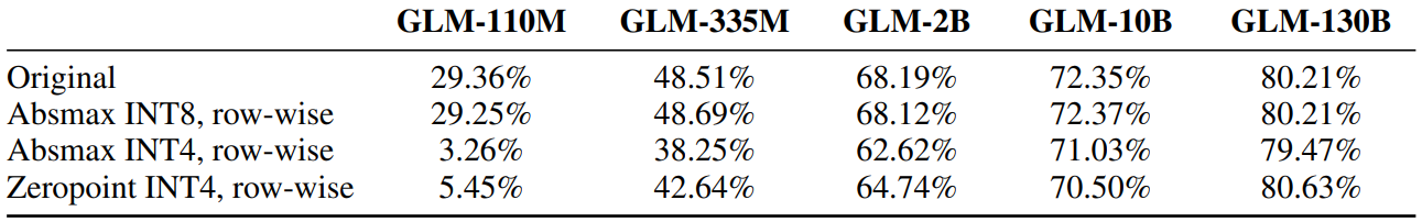 하지만 GLM-130B에는 활성화의 이상치가 30% 정도로 매우 많다. 따라서 그러한 대처들이 효율적이지 않고, 활성화는 FP16으로 유지하면서 선형인 가중치만 INT4로 양자화하는 방법을 선택했다.