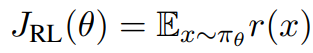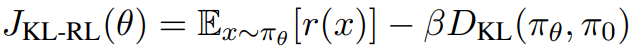 πθ는 피라미터 θ를 가진 LM이고, 이를 보상 함수 r을 통해 fine-tuning 하기 위한 강화 학습의 목표는 LM 분포 하에서 예상되는 보상이다.