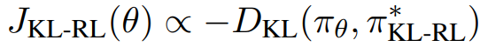 KL 정규화된 RL 목표는 LM 분포와 목표 분포 사이의 KL-divergence를 최소화하는 형태로 표현할 수 있다.