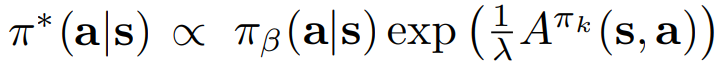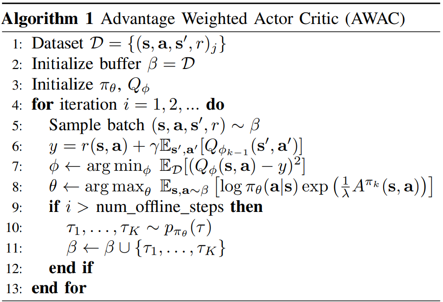 AWAC(Advantage Weighted Actor-Critic)에는 Qπ를 학습하는 정책 평가 단계와 π를 업데이트하는 정책 개선 단계가 있다.