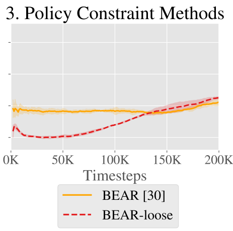 제약 조건이 있는 offline RL algorithm인 BEAR은 offline에서는 좋은 성능을 발휘하지만 online fine-tuning 시(-loose) 어려움을 겪는다.