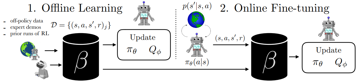 Offline dataset D = {(s, a, s', r)}가 주어지면 D를 통해 사전 훈련하고 소량의 online 상호 작용을 통해 최적의 정책을 학습하는 것이 목표.