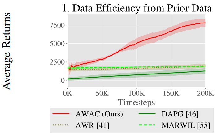 Offline data를 통한 사전 훈련과 online data 수집을 통한 정책 개선을 연결하기 위해 weighted maximum likeihood를 사용한 Advantage Weighted Actor Critic (AWAC) 알고리즘을 제안한다.