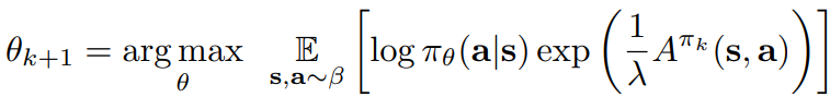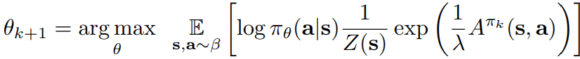 정책 업데이트는 다음과 같이 weighted maximum likelihood를 계산한다.