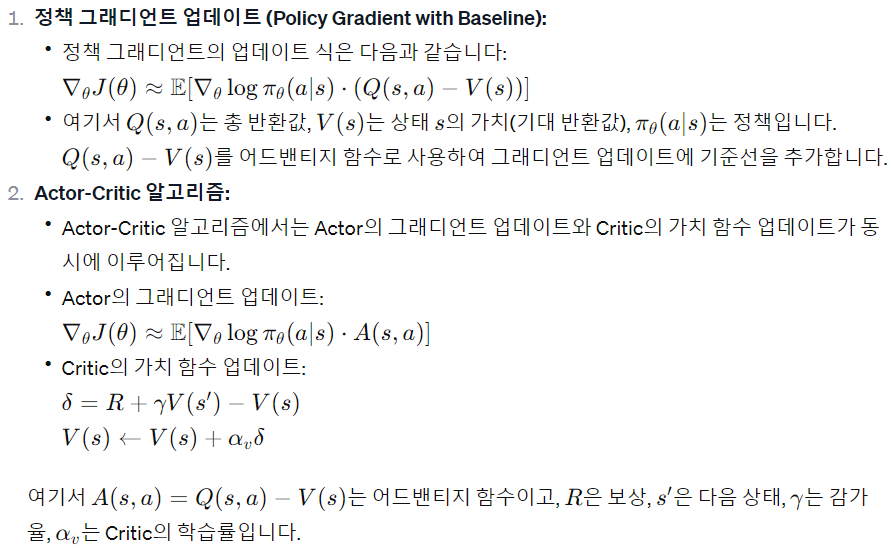 정리하면 actor-critic algorithm은 policy gradient update에서 baseline function으로 critic network를 사용하는 것이다.
