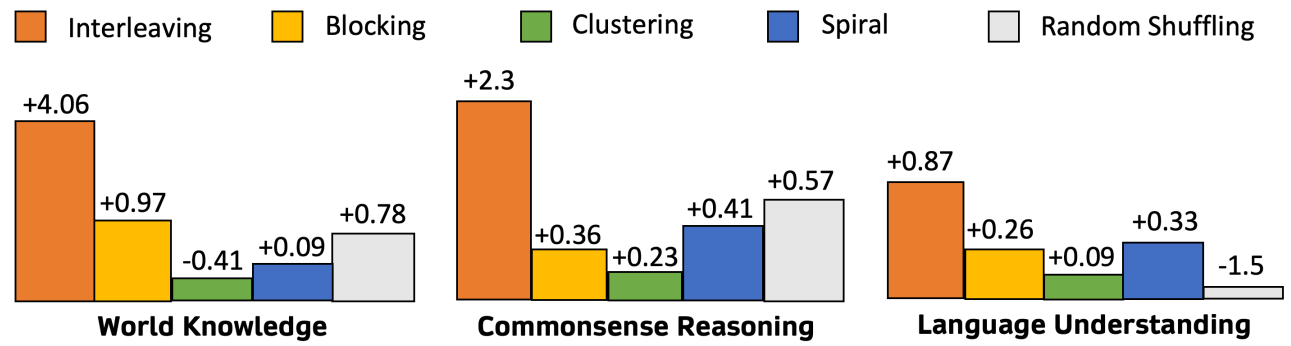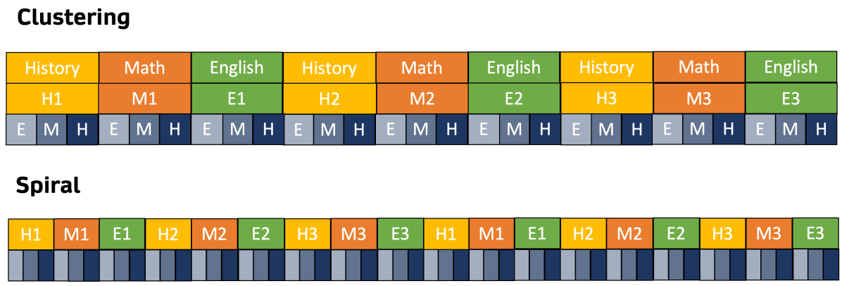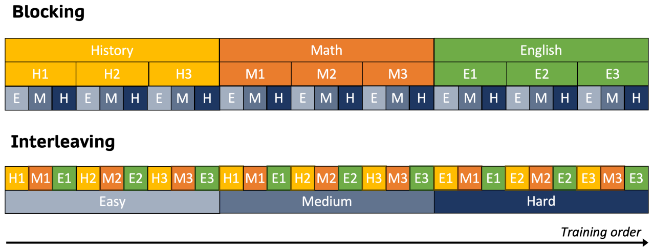 Blocking은 이전에 학습한 개념을 잊어버리는 인지 붕괴의 위험이 있어 interleaving 방법을 사용하여 훈련한다.