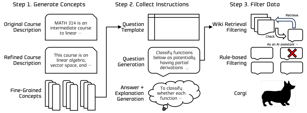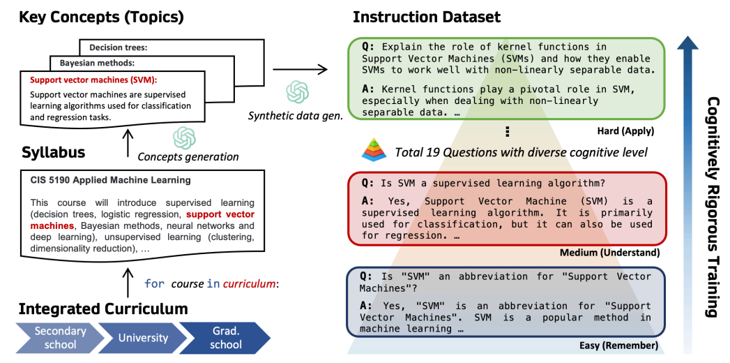 인간 교육의 점진적이고 조직적인 특성을 모방하는 고도로 구조화된 합성 데이터 세트와 이를 이용한 교육 프레임워크인 CORGI(Cognitively hardest instructions) 제안