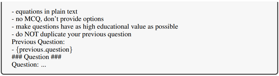 국제 중등 교육 커리큘럼(i.e. Cambridge IGCSE curriculum)에서 제공하는 구체적인 교육 프레임워크와 여러 대학 카탈로그를 통합하여 교육 단계에서 지속적인 발전을 구축하고 chatGPT와 같은 교사 모델을 통해 다양한 주제를 추출하여 포괄적인 질문 세트를 만들었다.