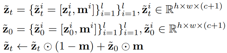 각 프레임의 채널 차원에 마스크 채널을 추가하고 마스크에 따라 zti를 z0i로 교체함으로써, 나머지 프레임을 조건으로 새로운 프레임을 생성할 수 있는 조건부 모델과 무조건 모델을 공동으로 훈련할 수 있다. (모두 0이면 무조건 모델)