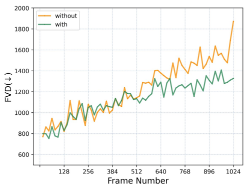 긴 비디오에 대한 성능 저하를 완화하기 위해 조건부 잠재 섭동과 무조건 지침 사용.