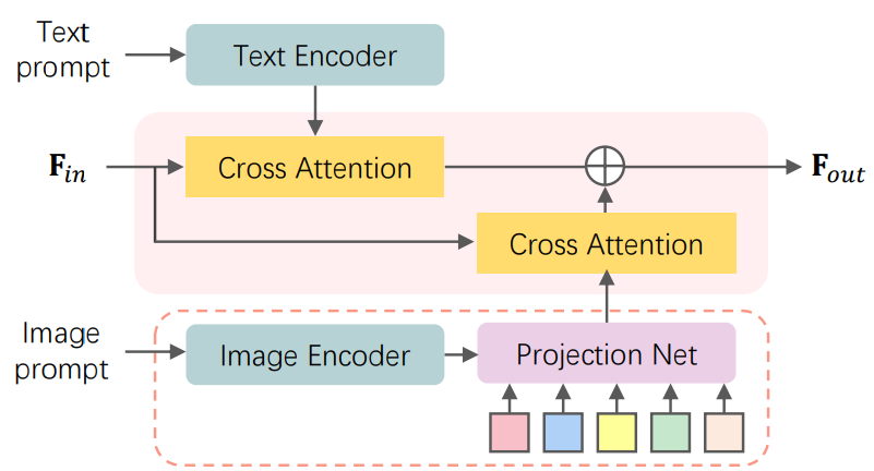 Projection network를 사용하여 visual token을 임베딩으로 변환하고, 다음 그림과 같이 dual cross-attention을 통해 text, image prompt를 feature에 반영한다. (각 attention에서 query Q는 같다.)