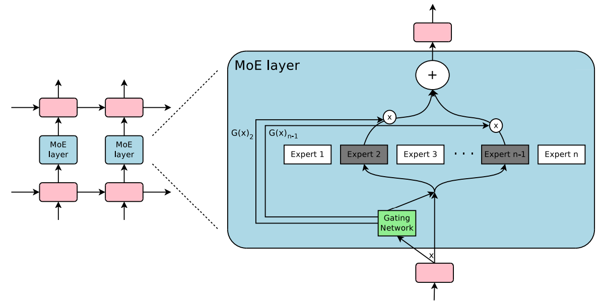MoE는 n개의 전문가 네트워크 세트와 희소 벡터를 출력하는 gating network G로 구성된다.