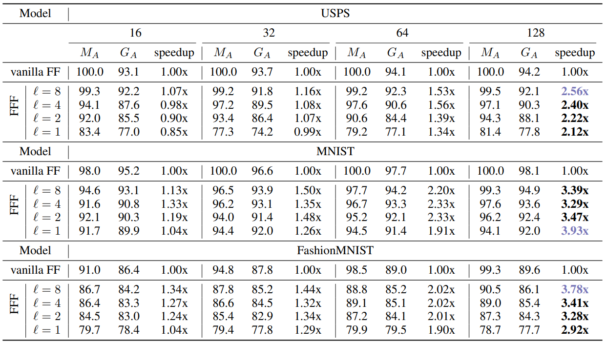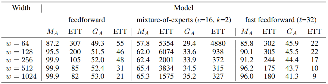 FFF는 feedforward 보다 최대 220배 빠르고 뉴런의 1%만 사용하면서 성능의 95%를 유지할 수 있다.