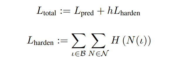 연구진은 실험에서 선택 쌍 <1-p, p>의 엔트로피가 0.1 미만일 경우 추론 성능에 큰 편차가 발생하지 않는 것을 관찰했고, 배치 내에서 모든 노드의 엔트로피를 줄이는 손실항을 추가한다.