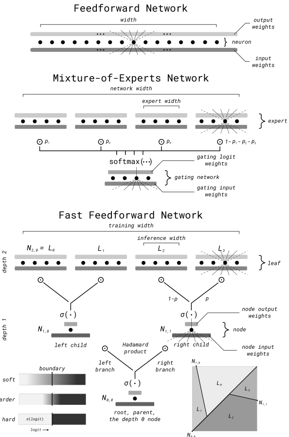 Fast feedforward network를 도입하여 계층 크기와 추론 비용 사이의 비례를 끊는다.