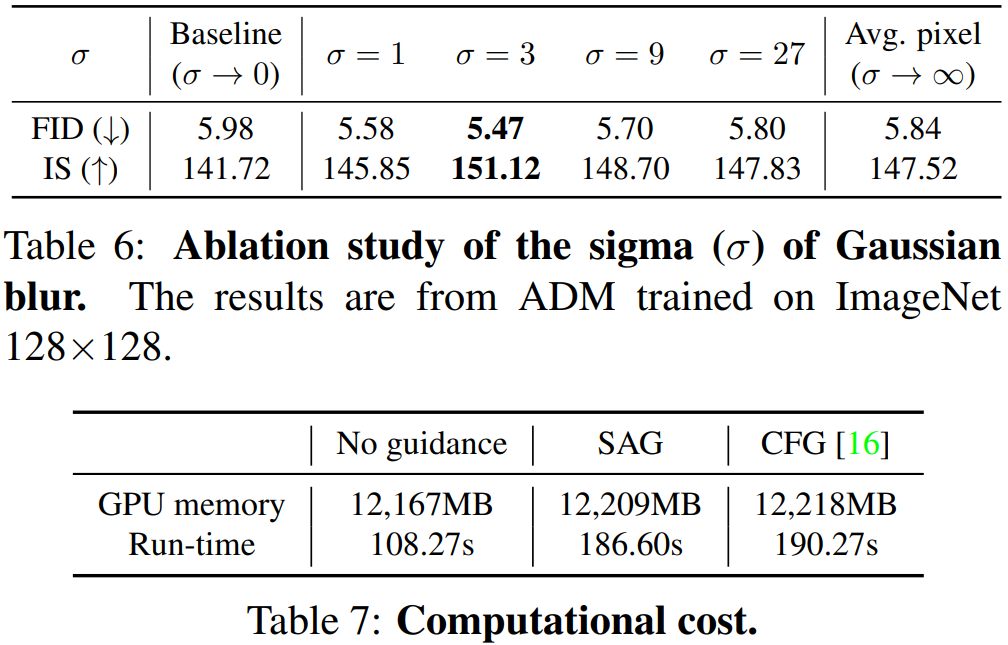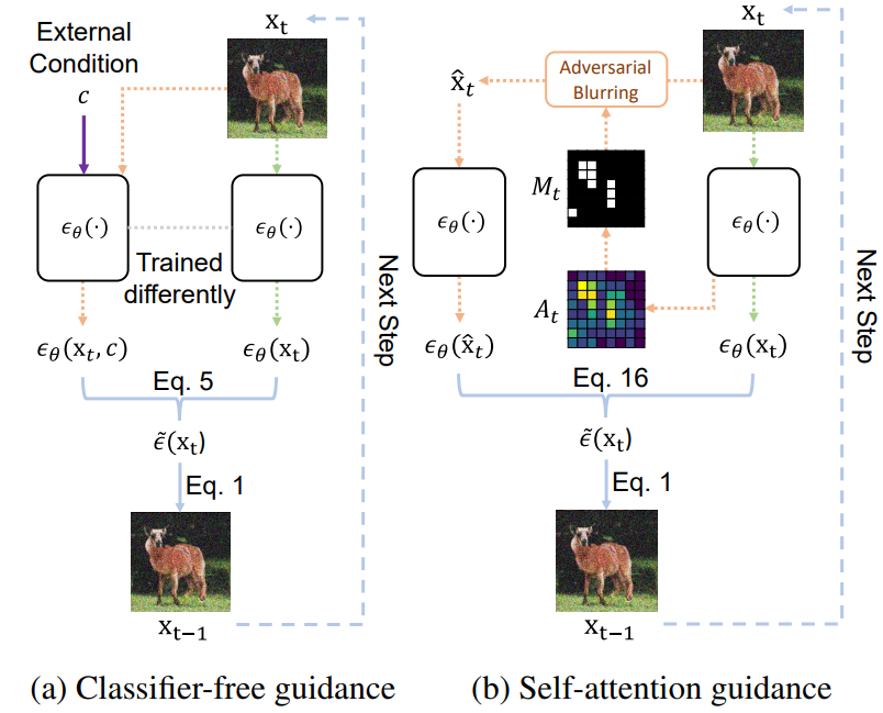 확산 모델의 중간 샘플의 내부 정보가 지침 역할을 할 수 있다는 직관을 바탕으로 blur guidance 제안. 하지만 blur가 구조적 모호성을 도입할 수 있기 때문에 핵심 정보를 캡처할 수 있는 self-attention을 활용한 SAG 또한 제안.