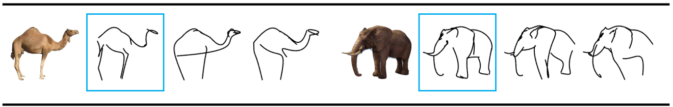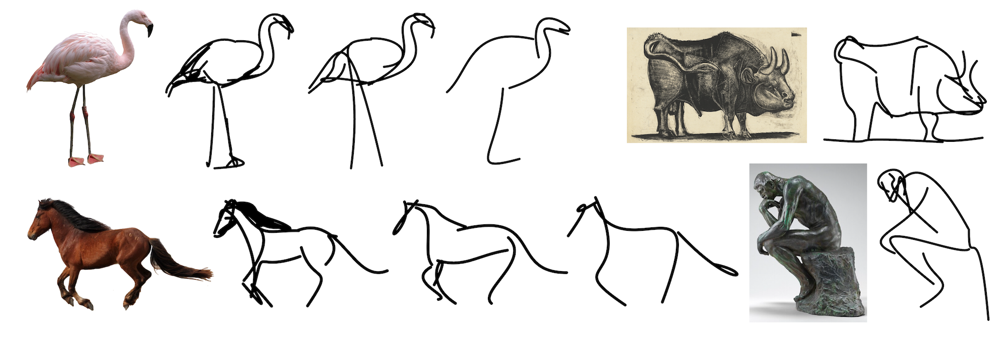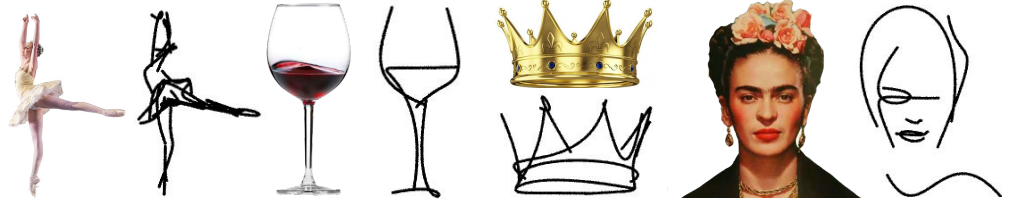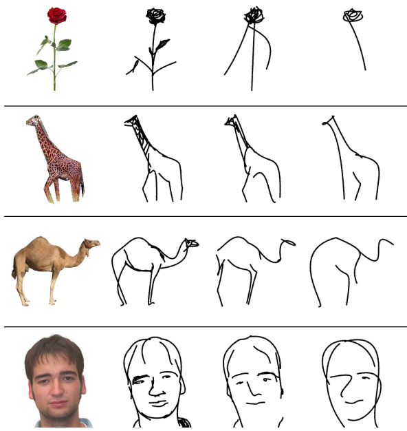 스케치는 흰 배경에 배치된 검은 획(베지어 곡선) 세트로 정의되며 추상화 수준은 획 수에 따라 결정된다.