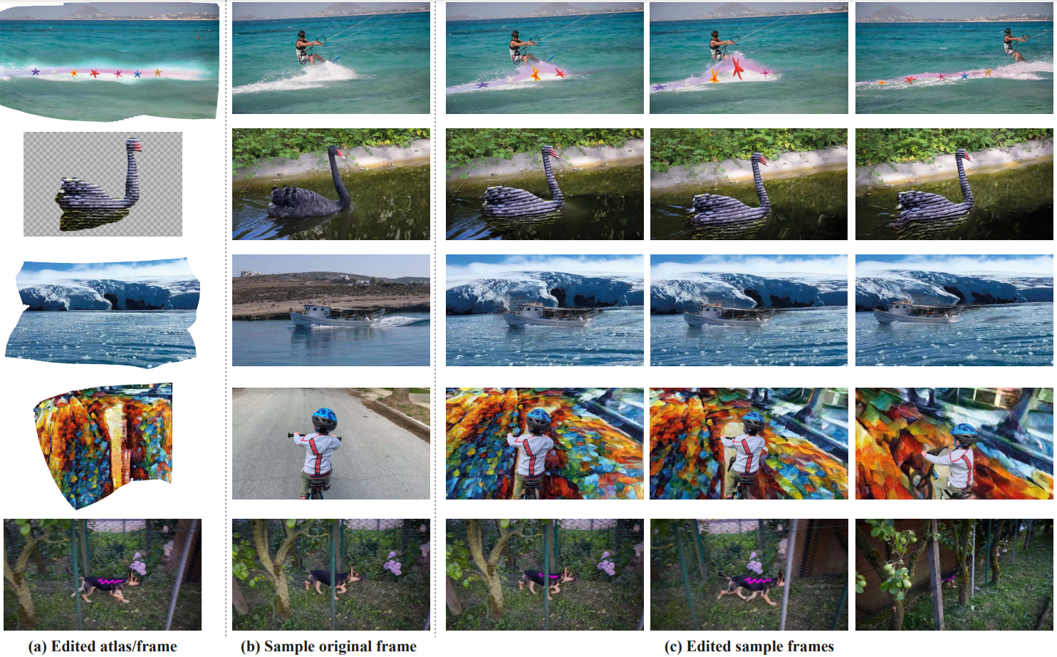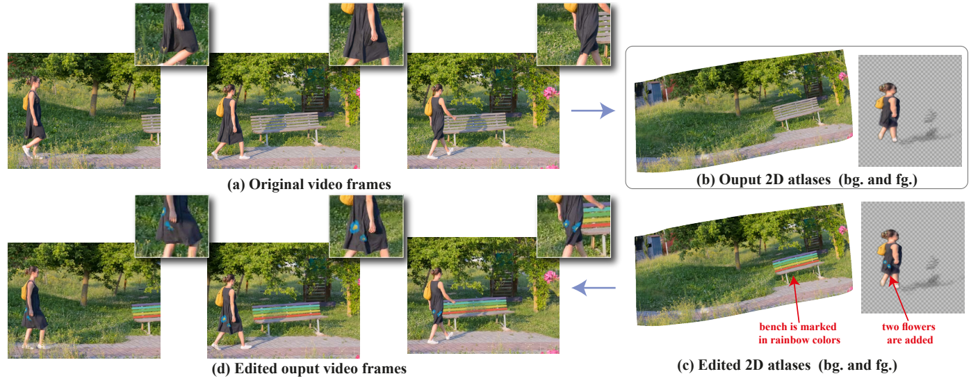 모델을 훈련하면 원하는 프레임 지점에서 배경 atlas와 전경 atlas를 생성할 수 있고, 해당 atlas를 편집하여 적용할 수 있다.