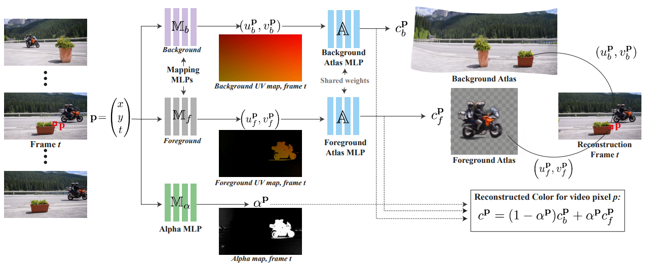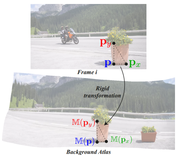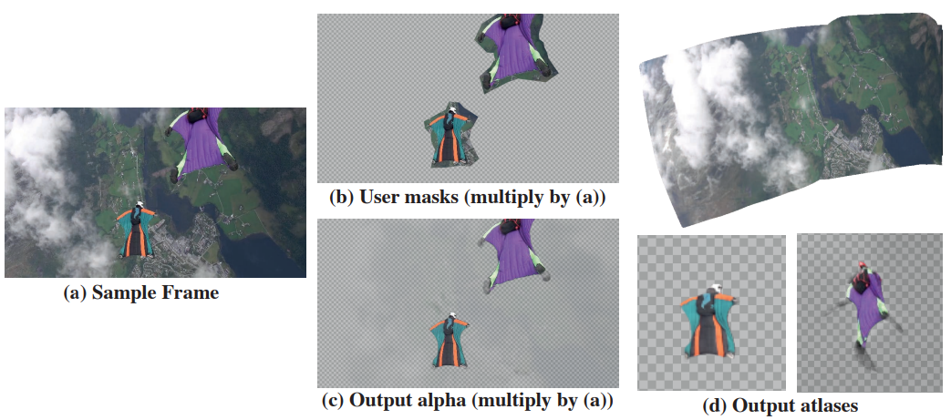 이 방법의 입력은 비디오와 관심 객체를 식별할 마스크이며, 목표는 배경과 객체의 atlas set에 대해 각 비디오 픽셀을 매핑하고, 각 픽셀의 불투명도 값을 추정하는 것이다.