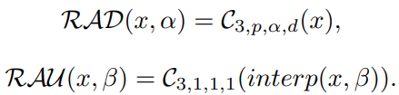 RAD, RAU는 입출력 치수를 맞추기 위한 계층으로 e.g. 1024x1024 생성의 경우 α, β = 4이고 p, d = 2로 dilation을 포함한다.