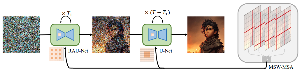따라서 임계 timestep T1을 설정하여 t > T1일 때는 RAU-Net을, T1 > t일 때는 U-Net을 사용한다. (T1 = 20~40)