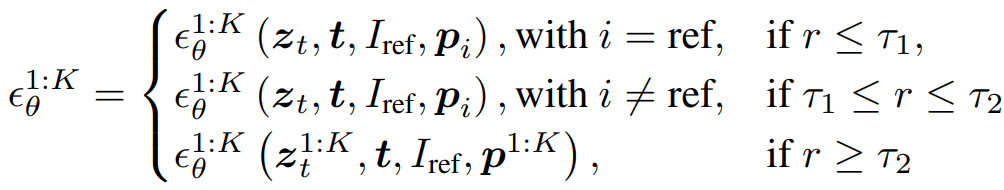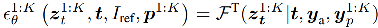 참조 이미지 Iref, K 프레임의 모션 시퀀스 p1:K이 주어질 때 비디오 I1:K을 생성하는 것이 목표이다.