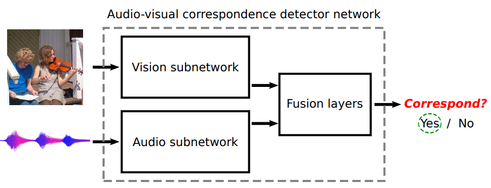다음 그림과 같은 audio-visual correspondence(AVC) task를 통해 학습한다.