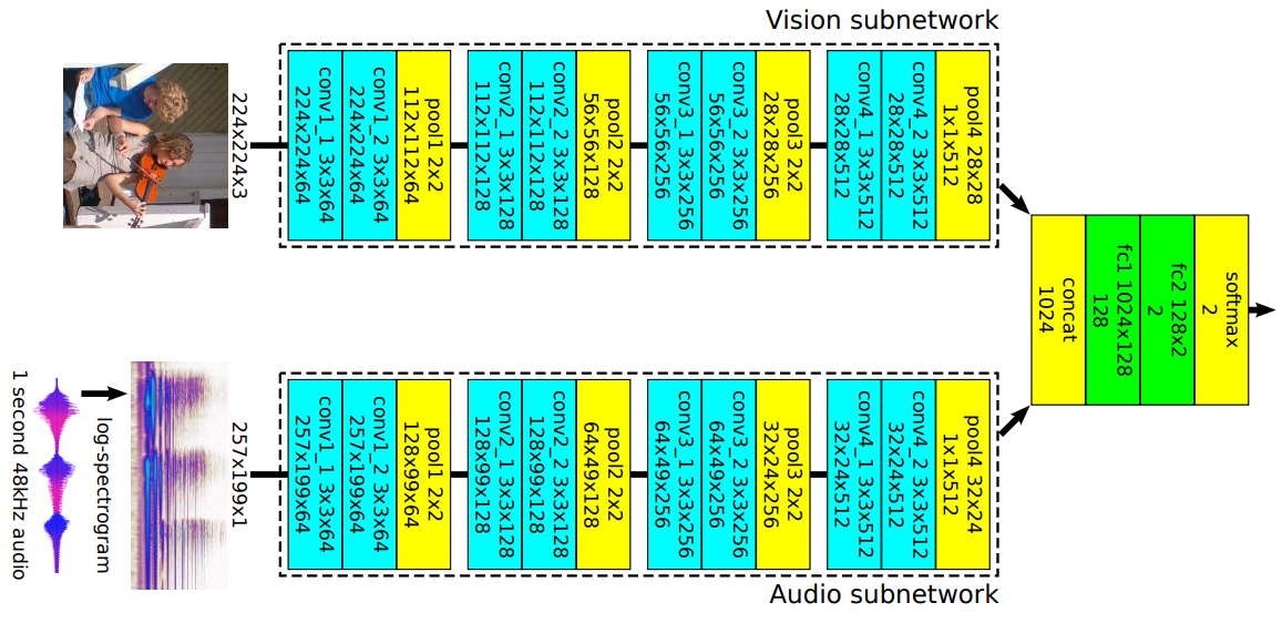 이 논문의 의미는 원시 비디오를 통한 visual-audio 표현 학습을 시도하였다는 데에 있으며, 상당히 옛날 논문이라 네트워크 구조는 의미 없으므로 생략.