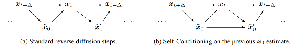 Self-conditioning은 이 예측값을 버리지 않고 다음 예측에 대한 조건으로 사용하는 것이다. (b)