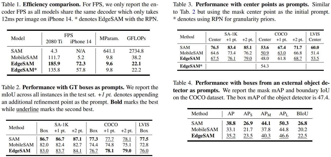 Edge device에서의 효율적인 실행을 위한 SAM의 가속 변형인 EdgeSAM 제안.
