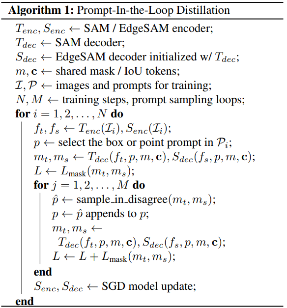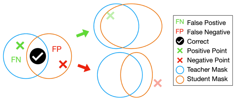 알고리즘을 간단하다. 우선 교사 모델과 학생 모델에서 마스크를 생성한 뒤, false positive 또는 false negative에 해당하는 prompt를 샘플링하고 기존 prompt에 추가하여 학생 모델이 해당 영역에 집중하도록 한다.