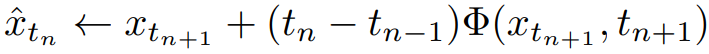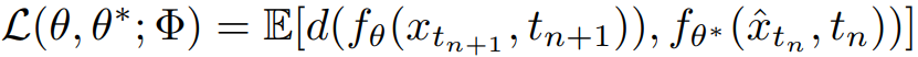 일관성 증류 손실은 fθ의 EMA인 fθ*과 xtn+1에서 ODE solver Φ를 통해 추정된 x̂tn에 대해 다음과 같이 정의된다.