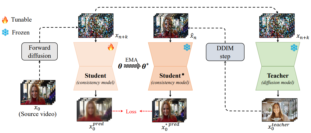 사전 훈련된 T2V 모델을 교사 모델로 사용하고 ODE solver로는 DDIM 사용.