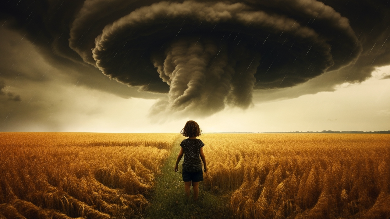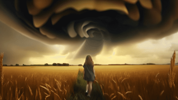 In a rice field , a girl walks toward the eye of the storm with her back to the camera.