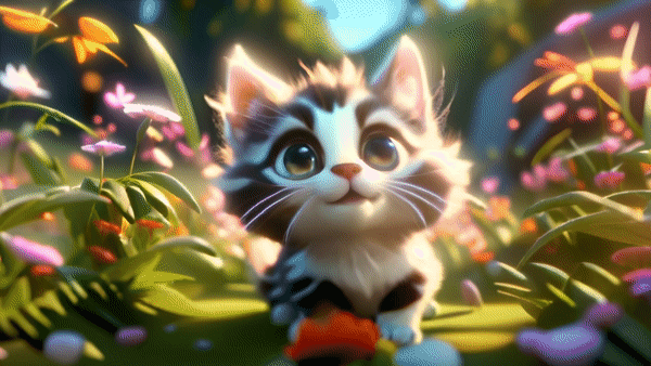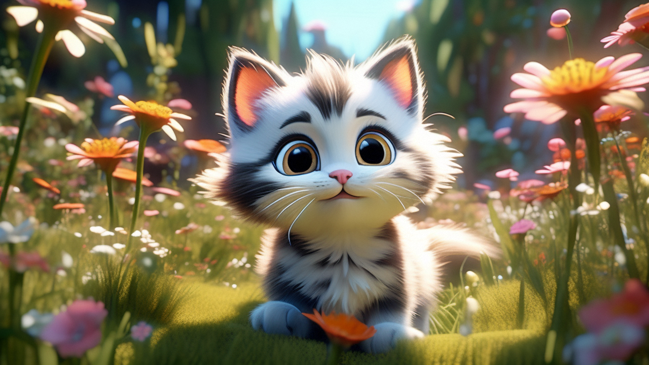 A cute kitten in the grass, 3D cartoon.