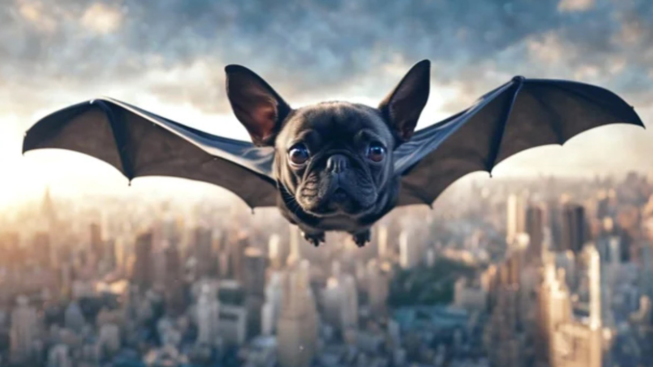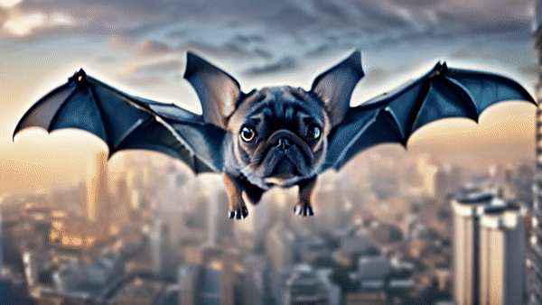 A winged dog flying over the city.