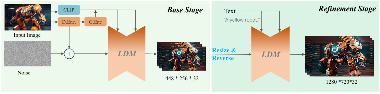 I2VGen-XL의 목적은 정적 이미지에서 비디오를 생성하는 것이다. 이를 달성하기 위해 2-stage 전략을 사용한다.
