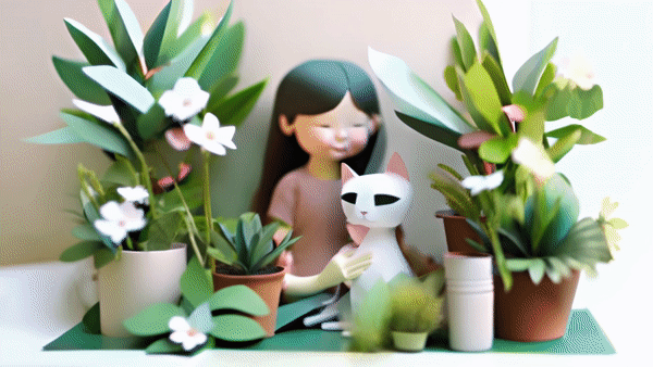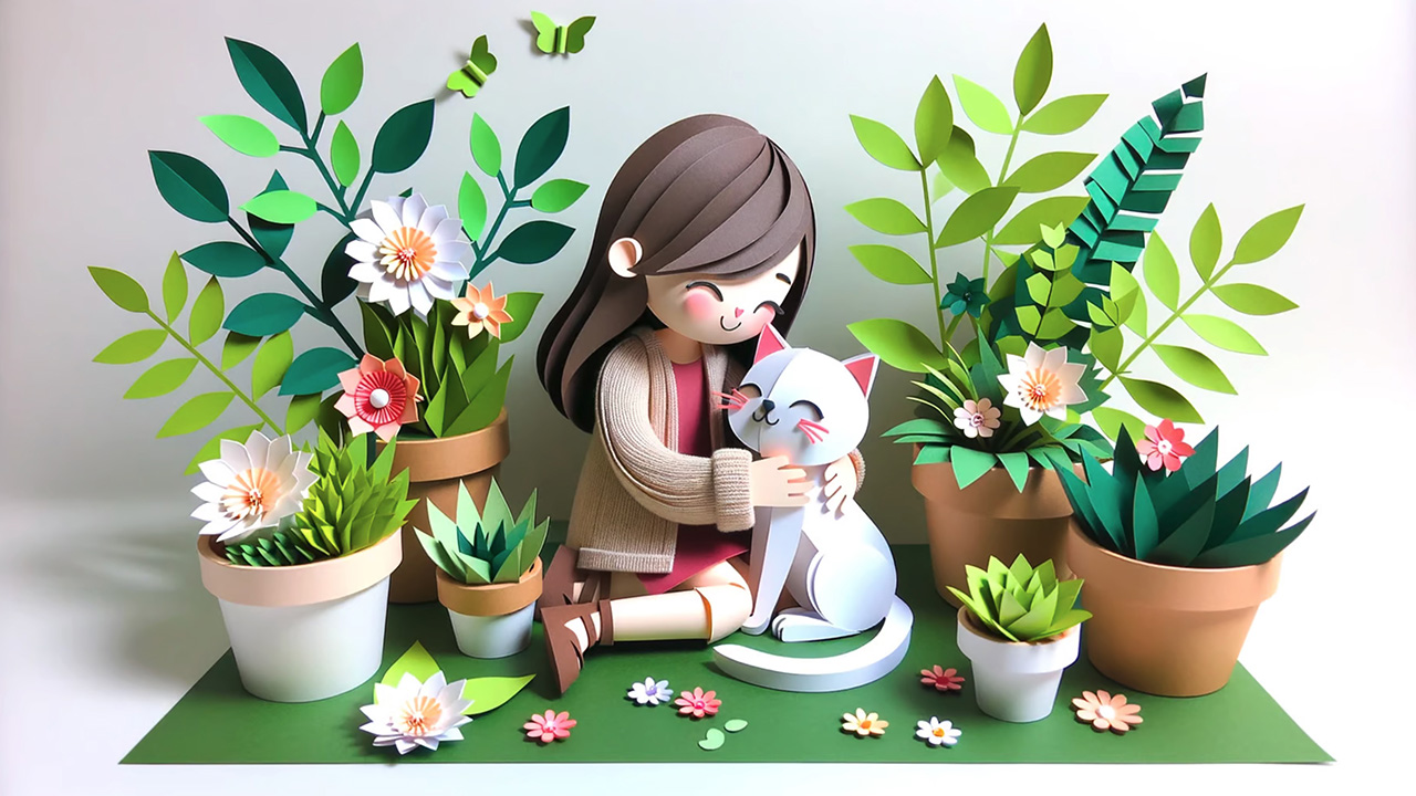 A paper craft art depicting a girl giving her cat a gentle hug. Both sit amidst potted plants, with the cat purring contentedly while the girl... | ![]() |