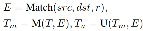 Token Merging은 먼저 토큰 시퀀스를 src, dst로 분할하고 유사도가 높은 토큰끼리 연결한 뒤 가장 유사한 r개의 pair를 선택하여 병합한다. 병합과 병합해제 M, U를 정의한다.
