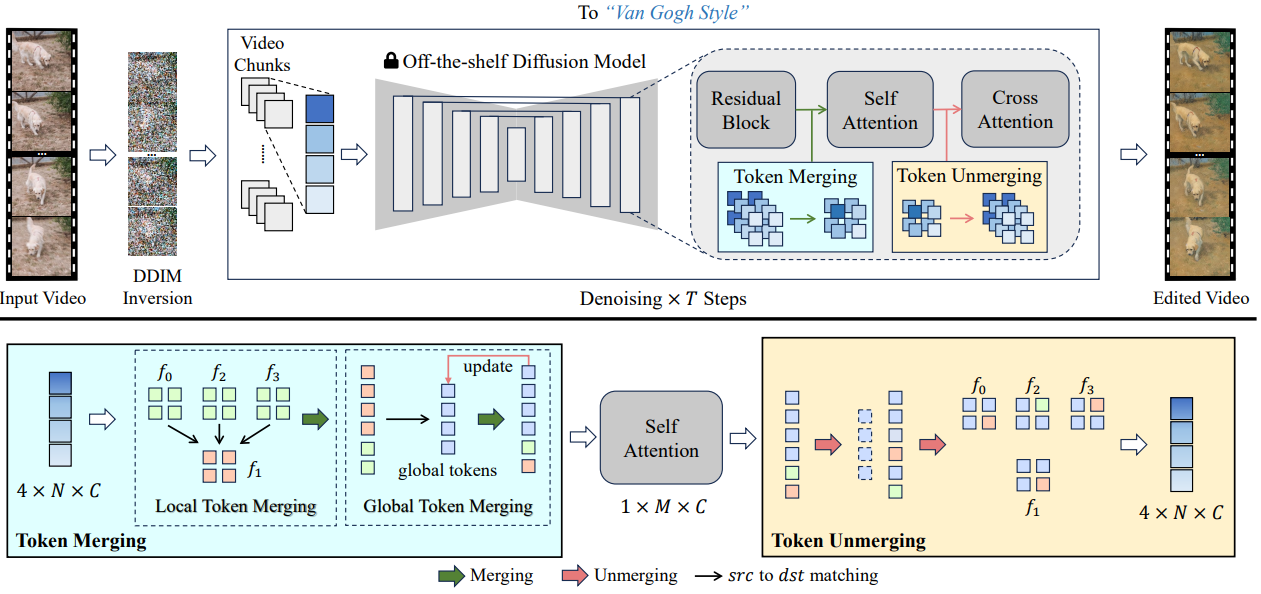 모든 프레임을 한 번에 처리할 수 없으므로 비디오를 청크로 나누고 청크 내 local merging과 청크 간 global merging을 수행하여 단기, 장기 일관성을 보장한다.