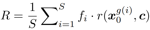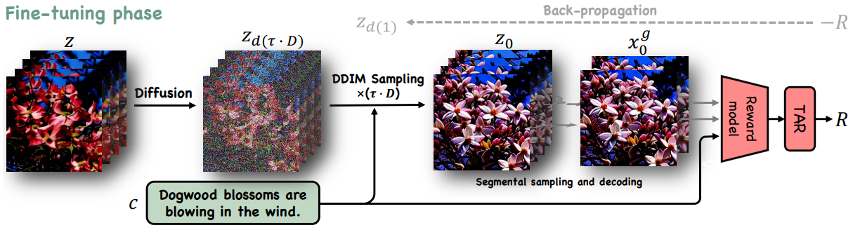 생성된 비디오 x0g를 각 segment로 나누고 프레임을 균일하게 샘플링하여 보상 r을 집계한다.